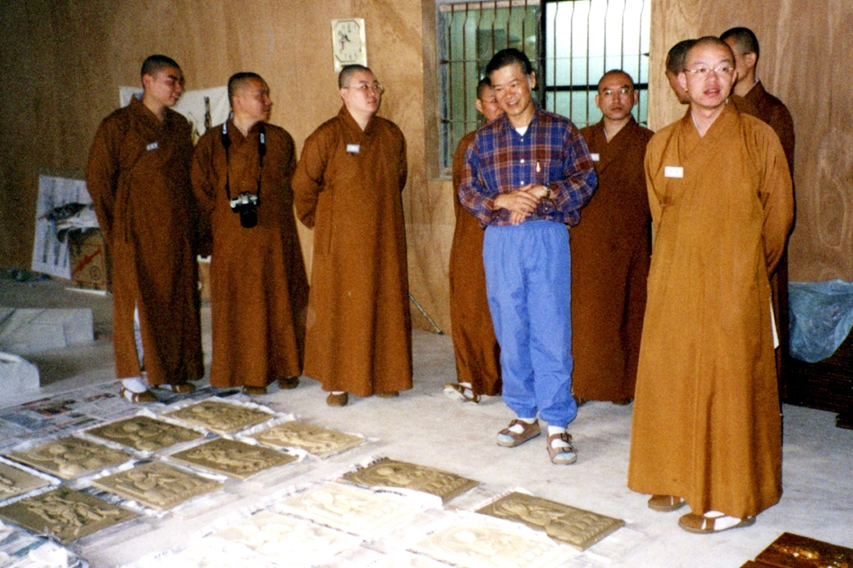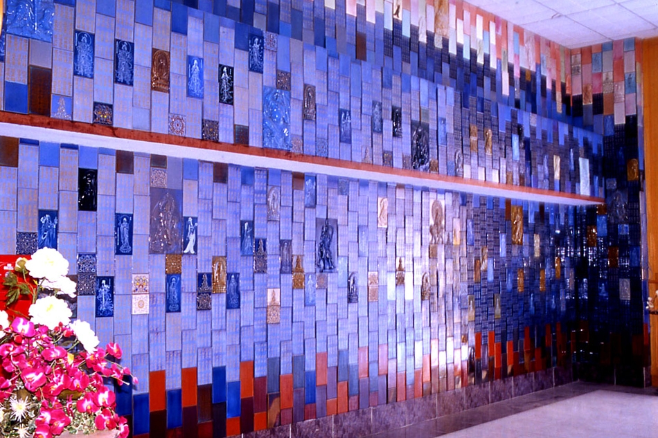 第二次利用大量不同尺寸的量製化陶片,將功德主姓名列於陶壁上,穿插佛像、蓮花及特別設計的圖樣,組合成的陶壁穿越整個雲居樓長廊,實為壯觀。