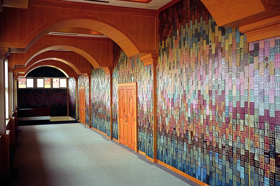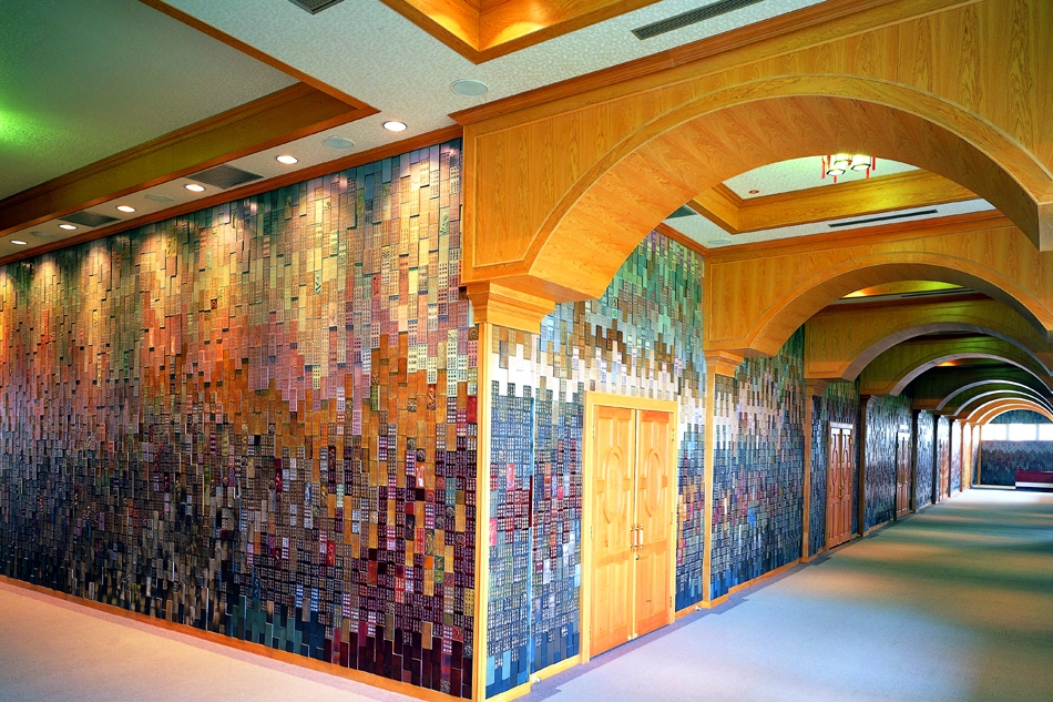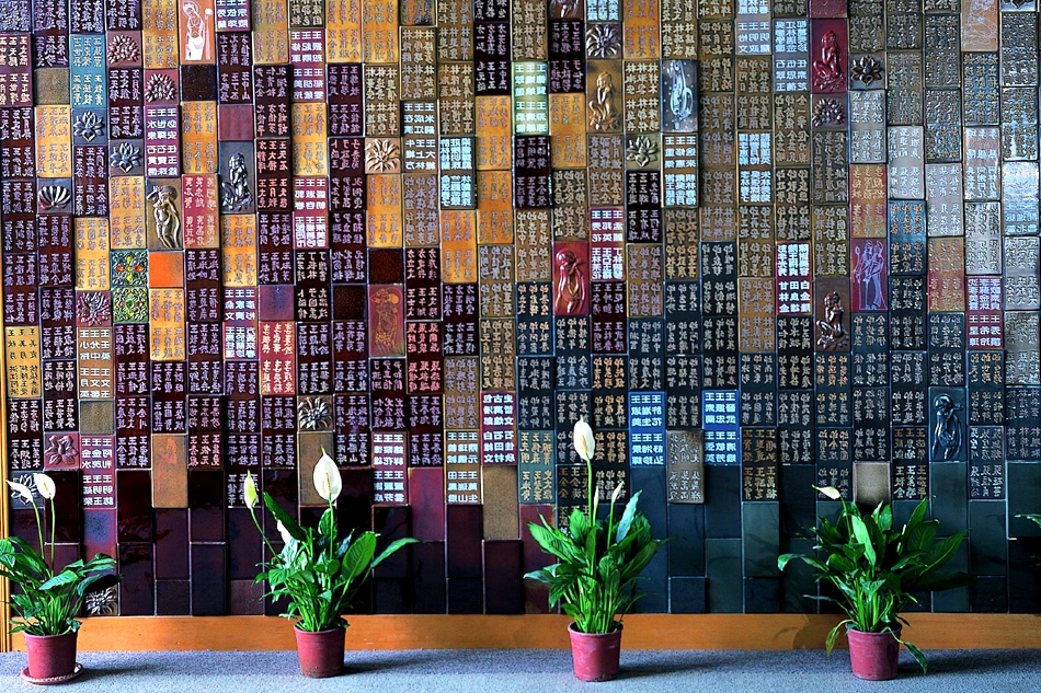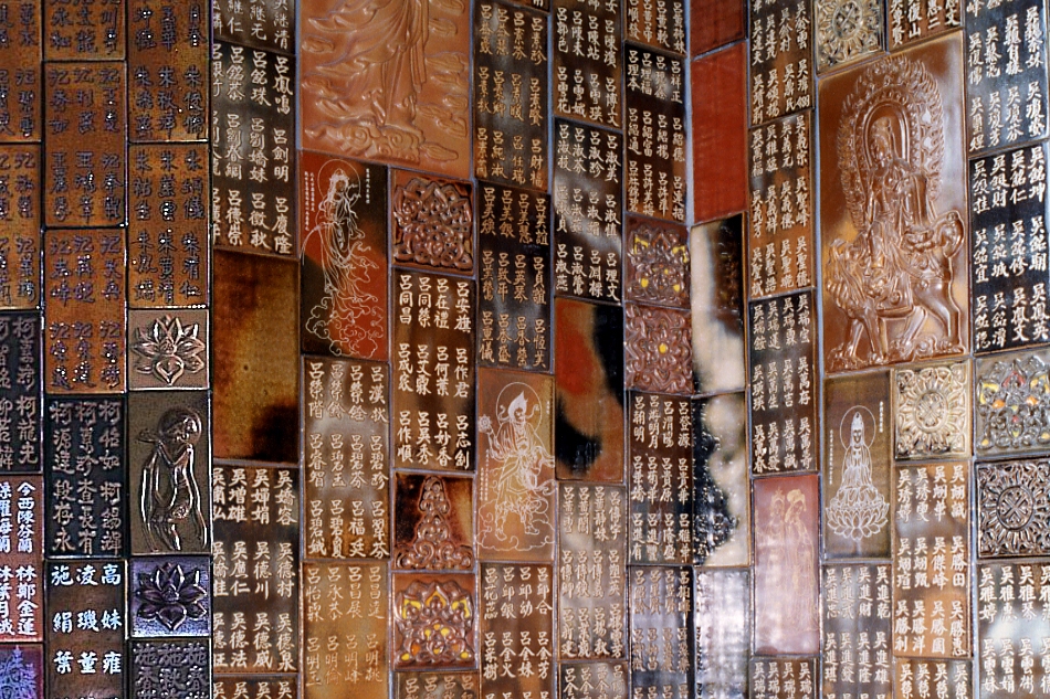 利用大量不同尺寸的量製化陶片,將功德主姓名列於陶壁上,穿插佛像、蓮花及特別設計的圖樣,組合成的陶壁穿越整個雲居樓長廊,實為壯觀。
