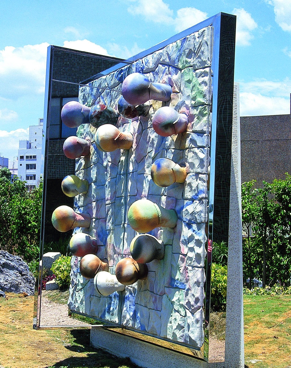 此作品是陳倬民先生在前教育廳長任內所提出的構想,以靜坐思過代替體罰,在不同的環境塑造個別差異。以靜的諧音「鏡」來創作,由各個角度看鏡中反射顯示出造型的意涵。